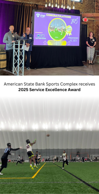 The American State Bank Sports Complex is a 470-foot by 250-foot air-inflated indoor turf facility. Designed to host athletic competitions and practice, wellness activities, and other events, the venue draws approximately 250,000 visits annually.